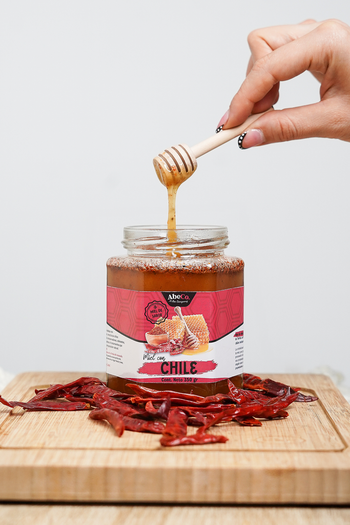 Miel de abeja Premium elaborada de forma artesanal adicionada con una mezcla de chiles secos naturales.
